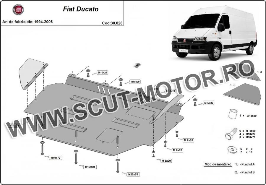 Scutul este noua si se potriveste perfect pentru toate tipurile de motorizare Fiat Ducato fabricat între ani 1994 - 2006. Scutul protejeazã: motor, cutie de viteză, radiator.