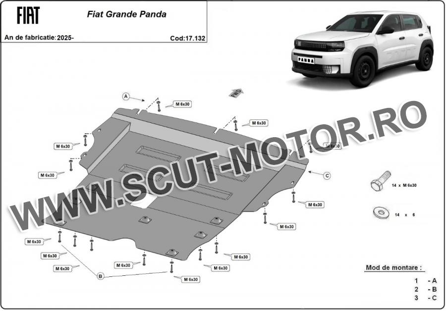 Scutul este noua si se potriveste perfect pentru toate tipurile de motorizare Fiat Grande Panda fabricat între ani 2025 - 2026. Scutul protejeazã: motor, cutie de viteză, jug motor/cadru motor.