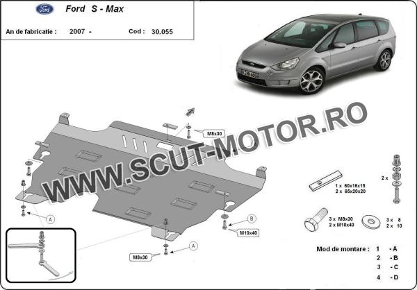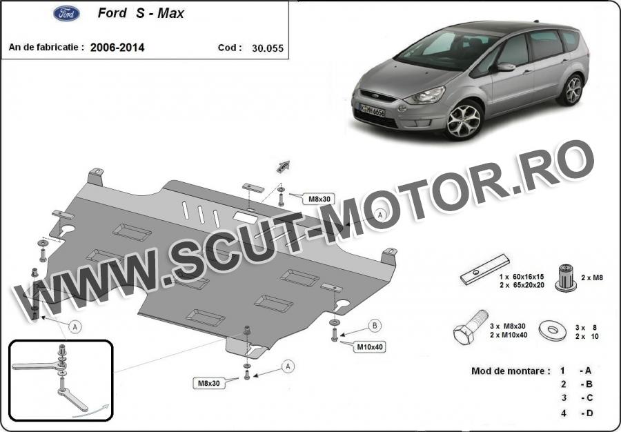 Scutul este noua si se potriveste perfect pentru toate tipurile de motorizare Ford S-Max fabricat între ani 2006 - 2015. Scutul protejeazã: motor, cutie de viteză, radiator.