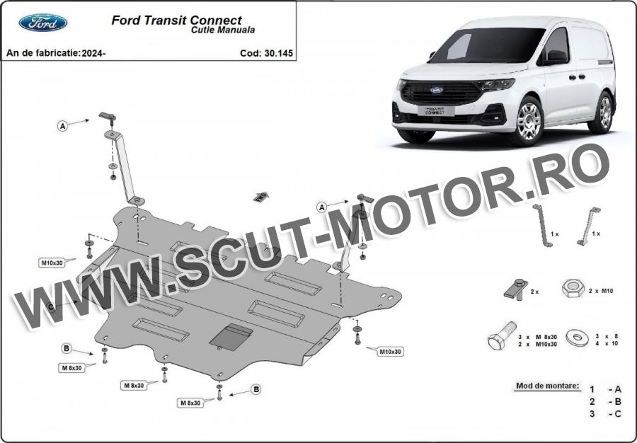 Scutul este noua si se potriveste perfect pentru toate tipurile de motorizare Ford Tranett Connect fabricat între ani 2024 - 2025. Scutul protejeazã: motor, cutie de viteză, radiator, bara față.