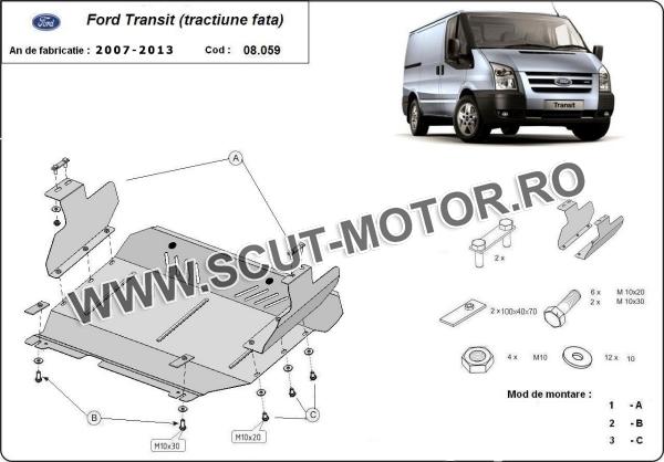 Scutul este noua si se potriveste perfect pentru toate tipurile de motorizare Ford Tranett fabricat între ani 2007 - 2013. Scutul protejeazã: motor, cutie de viteză.