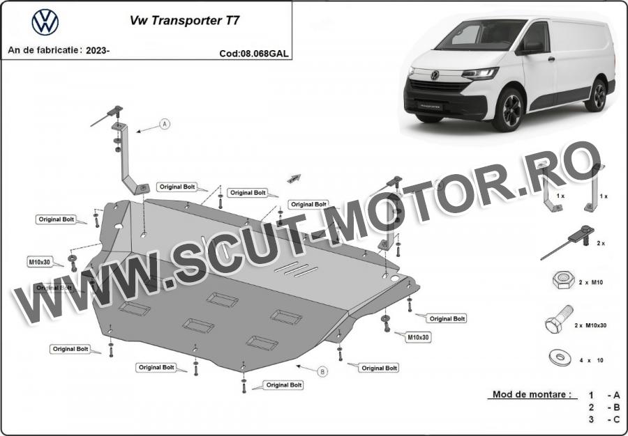 Scutul este noua si se potriveste perfect pentru toate tipurile de motorizare Volkswagen Transporter fabricat între ani 2023 - 2025. Scutul protejeazã: motor, cutie de viteză, radiator.