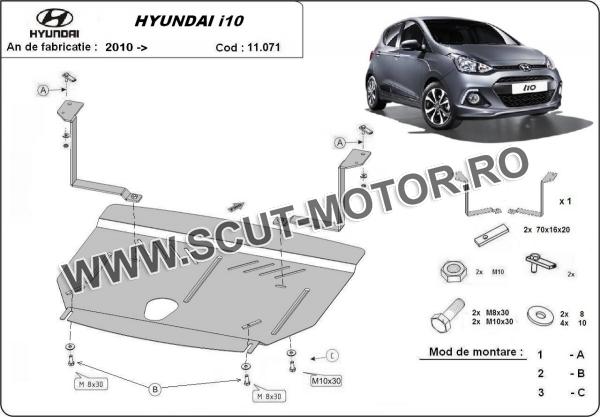 Scutul este noua si se potriveste perfect pentru tipurile de motorizare - Hyundai i10 fabricat între ani 2012 - 2017. Scutul protejeazã: motor, cutie de viteză, radiator.