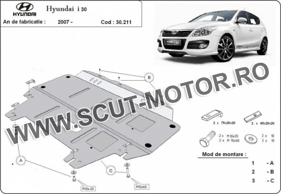 Scutul este noua si se potriveste perfect pentru toate tipurile de motorizare Hyundai i30 fabricat între ani 2007 - 2011. Scutul protejeazã: motor, cutie de viteză, radiator.