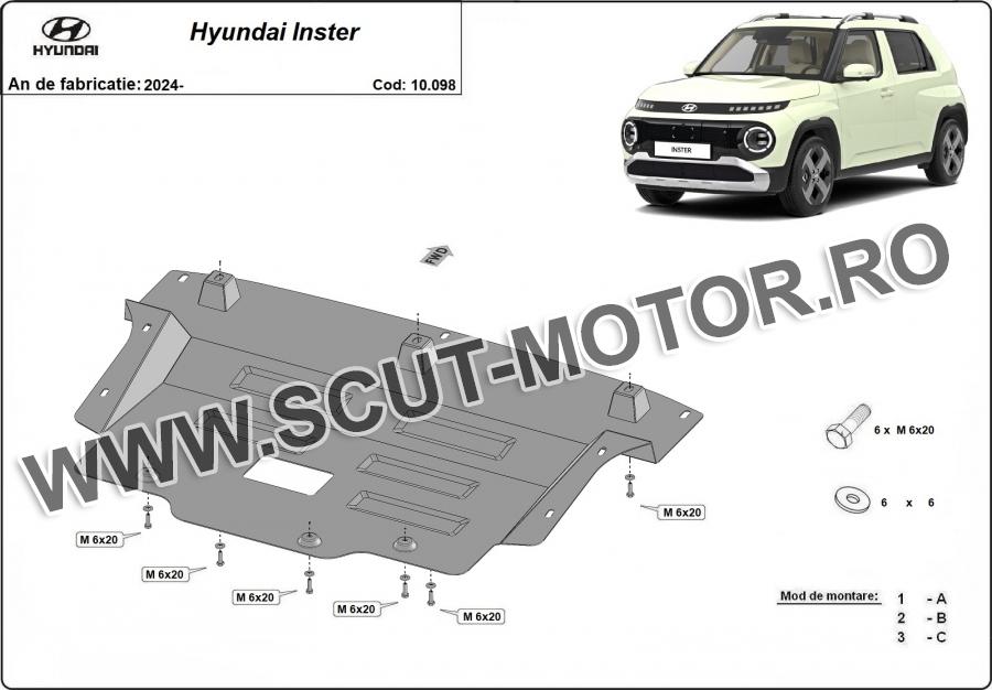 Scutul este noua si se potriveste perfect pentru toate tipurile de motorizare Hyundai Inster fabricat între ani 2024 - 2026. Scutul protejeazã: motor, cutie de viteză.
