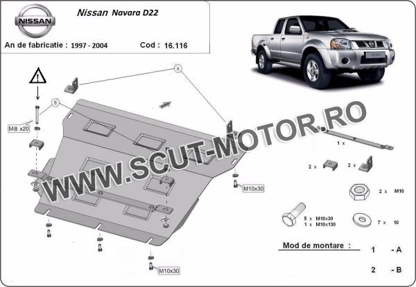 Scutul este noua si se potriveste perfect pentru toate tipurile de motorizare Nissan Navara D22 fabricat între ani 1997 - 2004. Scutul protejeazã: motor, radiator.