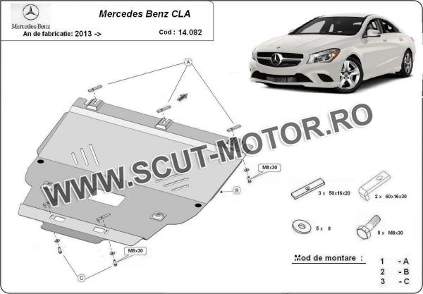 Scutul este noua si se potriveste perfect pentru toate tipurile de motorizare Mercedes CLA X117 fabricat între ani 2013 - 2019. Scutul protejeazã: motor, cutie de viteză, radiator.
