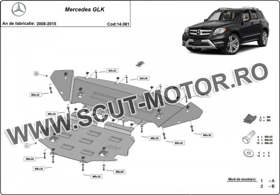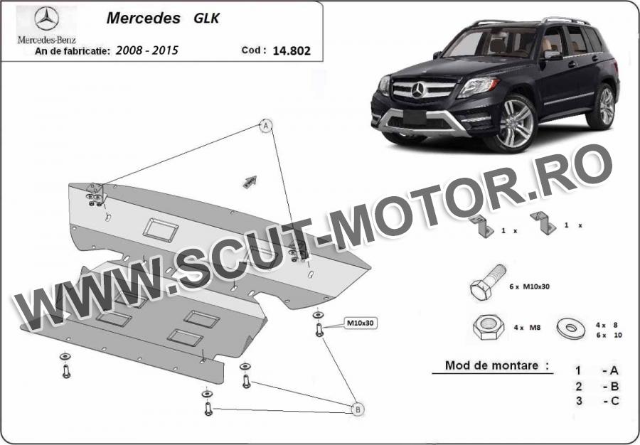 Scutul este noua si se potriveste perfect pentru toate tipurile de motorizare Mercedes GLK X204 fabricat între ani 2008 - 2025. Scutul protejeazã: motor, cutie de viteză, radiator, bara față.