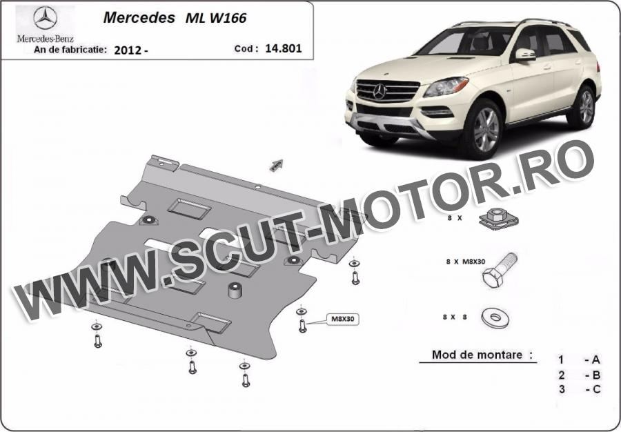 Scutul este noua si se potriveste perfect pentru toate tipurile de motorizare Mercedes ML W166 fabricat între ani 2011 - 2019. Scutul protejeazã: motor, radiator.