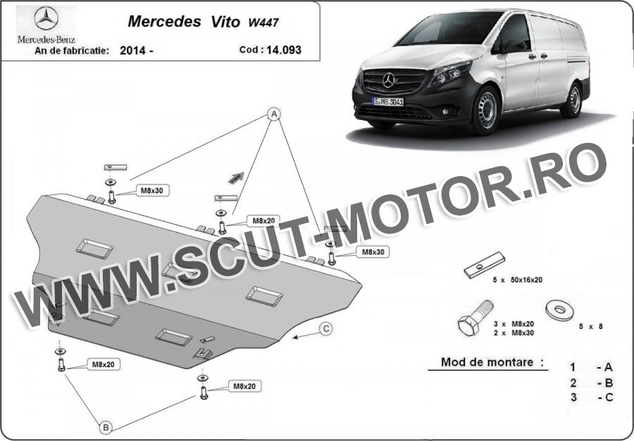Scutul este noua si se potriveste perfect pentru tipurile de motorizare 4x2, 1.6 D - Mercedes Vito - W447 fabricat între ani 2014 - 2025. Scutul protejeazã: motor, cutie de viteză, radiator.