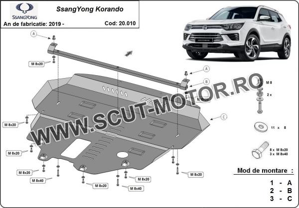Scutul este noua si se potriveste perfect pentru tipurile de motorizare toaate - SsangYong Korando fabricat între ani 2019 - 2025. Scutul protejeazã: motor, cutie de viteză, radiator.