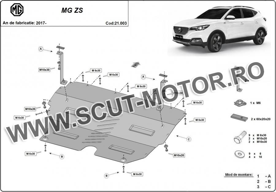 Scutul este noua si se potriveste perfect pentru tipurile de motorizare benzin - MG ZS EV fabricat între ani 2017 - 2024. Scutul protejeazã: motor, cutie de viteză, radiator.
