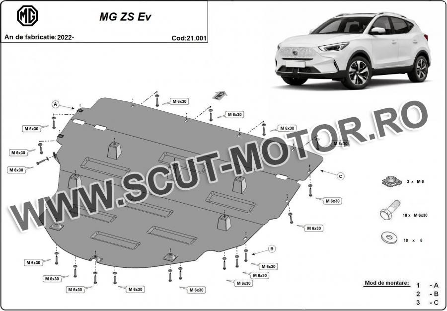 Scutul este noua si se potriveste perfect pentru tipurile de motorizare electric - MG ZS EV fabricat între ani 2022 - 2026. Scutul protejeazã: motor, cutie de viteză, radiator.