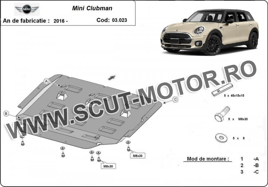 Scutul este noua si se potriveste perfect pentru toate tipurile de motorizare Mini Clubman fabricat între ani 2016 - 2025. Scutul protejeazã: motor, cutie de viteză, radiator.