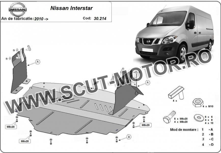 Scutul este noua si se potriveste perfect pentru toate tipurile de motorizare Nissan Interstar fabricat între ani 2010 - 2022. Scutul protejeazã: motor, cutie de viteză, radiator, bara față.