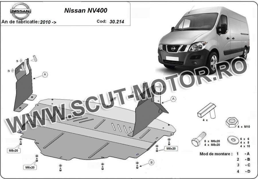 Scutul este noua si se potriveste perfect pentru toate tipurile de motorizare Nissan NV400 fabricat între ani 2010 - 2021. Scutul protejeazã: motor, cutie de viteză, radiator, bara față.