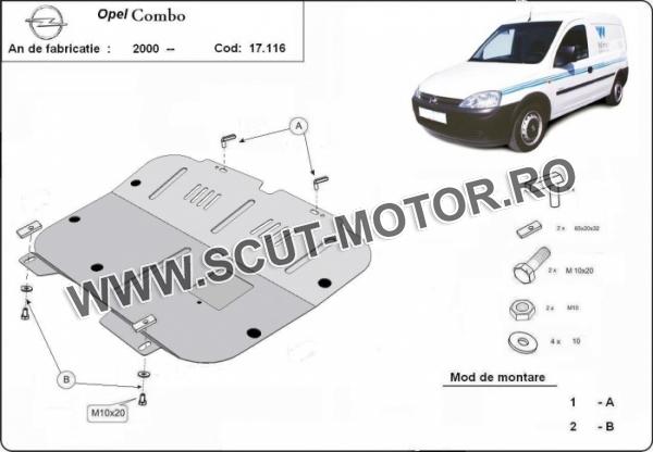 Scutul este noua si se potriveste perfect pentru toate tipurile de motorizare Opel Combo fabricat între ani 2000 - 2010. Scutul protejeazã: motor, cutie de viteză, radiator.
