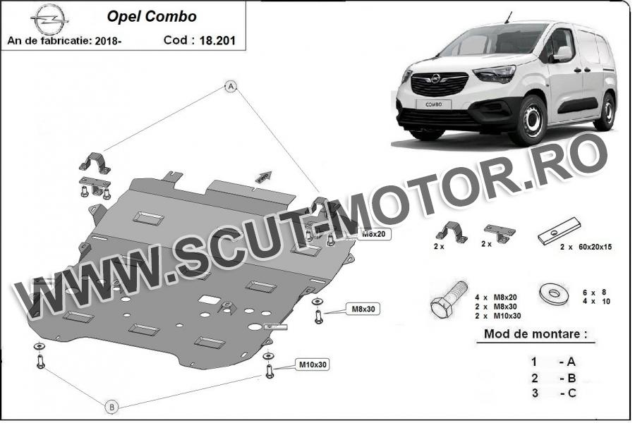 Scutul este noua si se potriveste perfect pentru toate tipurile de motorizare Opel Combo fabricat între ani 2018 - 2026. Scutul protejeazã: motor, cutie de viteză, radiator, bara față.