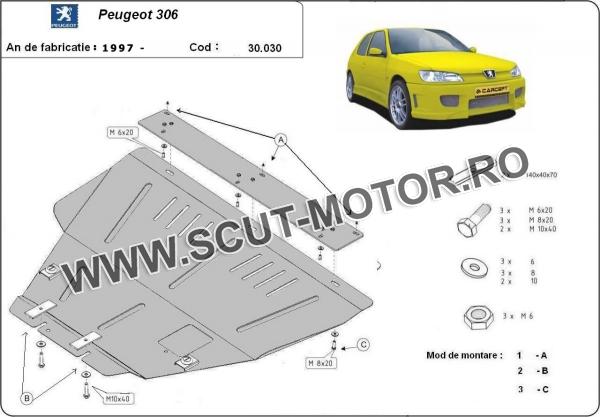 Scutul este noua si se potriveste perfect pentru toate tipurile de motorizare Peugeot 306 fabricat între ani 1994 - 2002. Scutul protejeazã: motor, cutie de viteză, radiator.