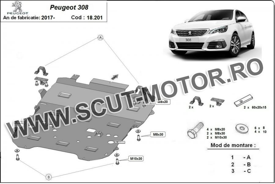 Scutul este noua si se potriveste perfect pentru toate tipurile de motorizare Peugeot 308 fabricat între ani 2018 - 2025. Scutul protejeazã: motor, cutie de viteză, radiator, bara față.