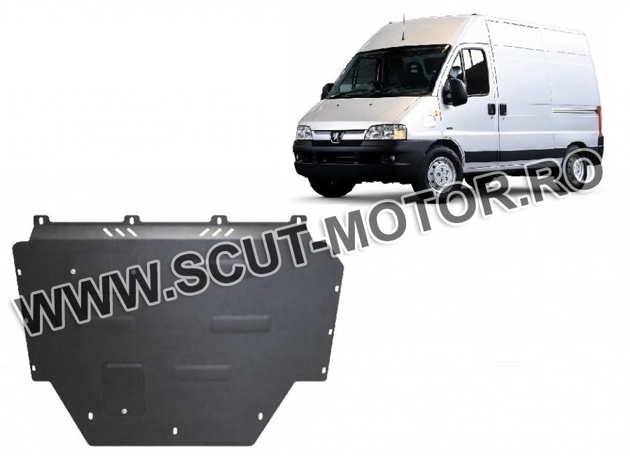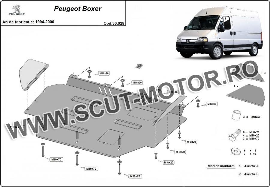 Scutul este noua si se potriveste perfect pentru toate tipurile de motorizare Peugeot Boxer fabricat între ani 1996 - 2006. Scutul protejeazã: motor, cutie de viteză, radiator.