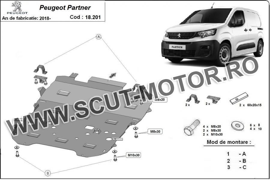 Scutul este noua si se potriveste perfect pentru toate tipurile de motorizare Peugeot Partner fabricat între ani 2018 - 2026.