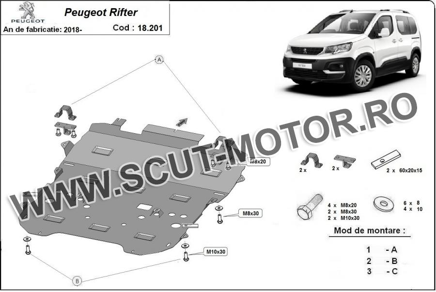 Scutul este noua si se potriveste perfect pentru toate tipurile de motorizare Peugeot Rifter fabricat între ani 2018 - 2026. Scutul protejeazã: motor, cutie de viteză, radiator, bara față.