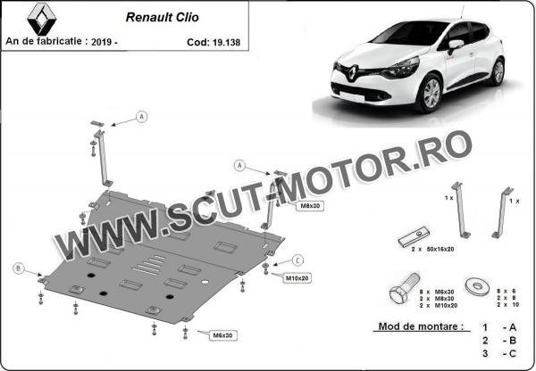 Scutul este noua si se potriveste perfect pentru tipurile de motorizare Toate - Renault Clio V fabricat între ani 2019 - 2025. Scutul protejeazã: motor, cutie de viteză, radiator.