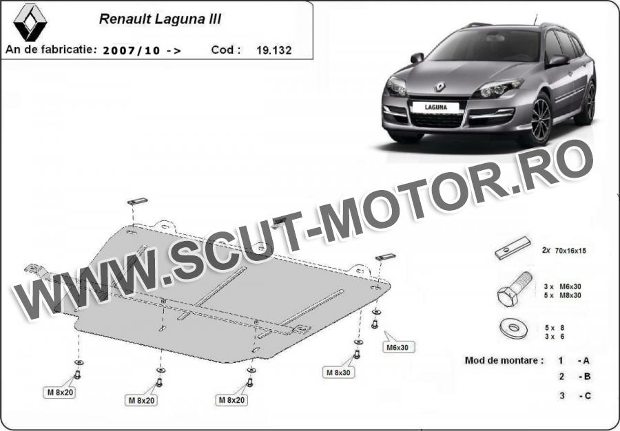Scutul este noua si se potriveste perfect pentru toate tipurile de motorizare Renault Laguna 3 fabricat între ani 2007 - 2015. Scutul protejeazã: motor, cutie de viteză.