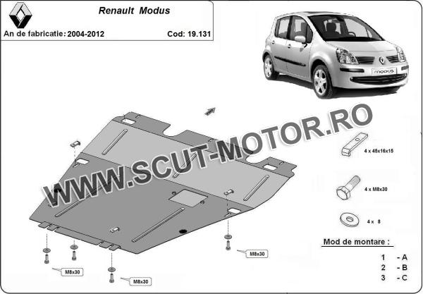 Scutul este noua si se potriveste perfect pentru toate tipurile de motorizare Renault Modus fabricat între ani 2004 - 2012. Scutul protejeazã: motor, cutie de viteză.
