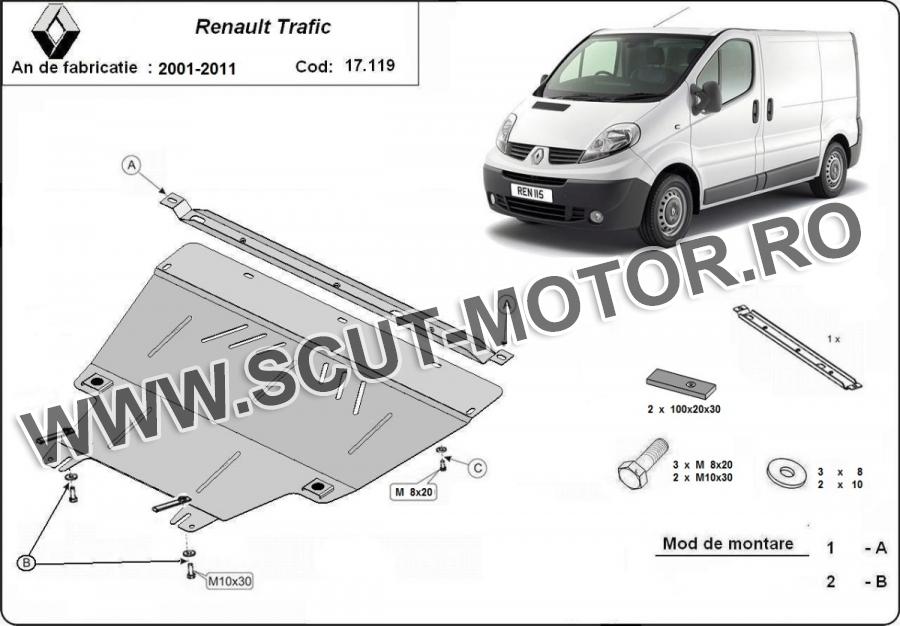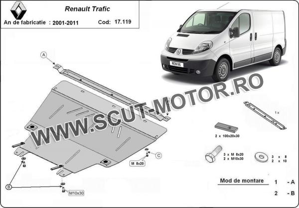 Scutul este noua si se potriveste perfect pentru toate tipurile de motorizare Renault Trafic fabricat între ani 2003 - 2014. Scutul protejeazã: motor, cutie de viteză, radiator.