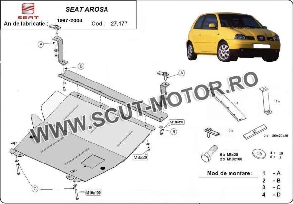 Scutul este noua si se potriveste perfect pentru tipurile de motorizare 1.0; 1.4; 1.4Tdi; 1.7Sdi - Seat Arosa fabricat între ani 1997 - 2004. Scutul protejeazã: motor, cutie de viteză.