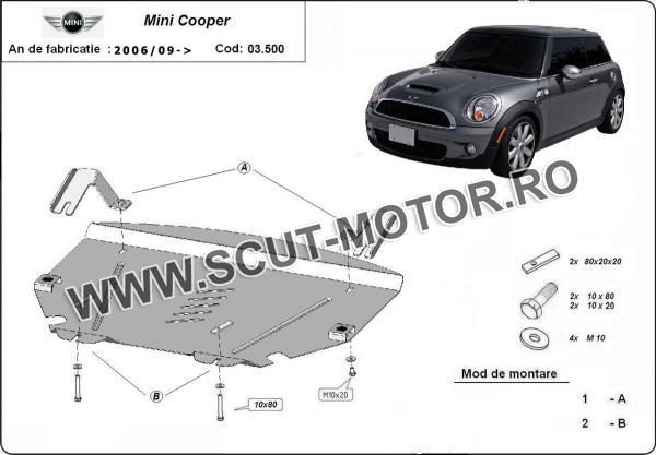 Scutul este noua si se potriveste perfect pentru toate tipurile de motorizare Mini Cooper fabricat între ani 2006 - 2014. Scutul protejeazã: motor, cutie de viteză.