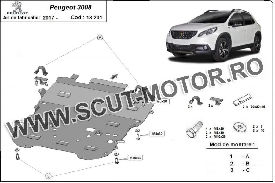 Scutul este noua si se potriveste perfect pentru toate tipurile de motorizare Peugeot 3008 fabricat între ani 2017 - 2025. Scutul protejeazã: motor, cutie de viteză, radiator, bara față.