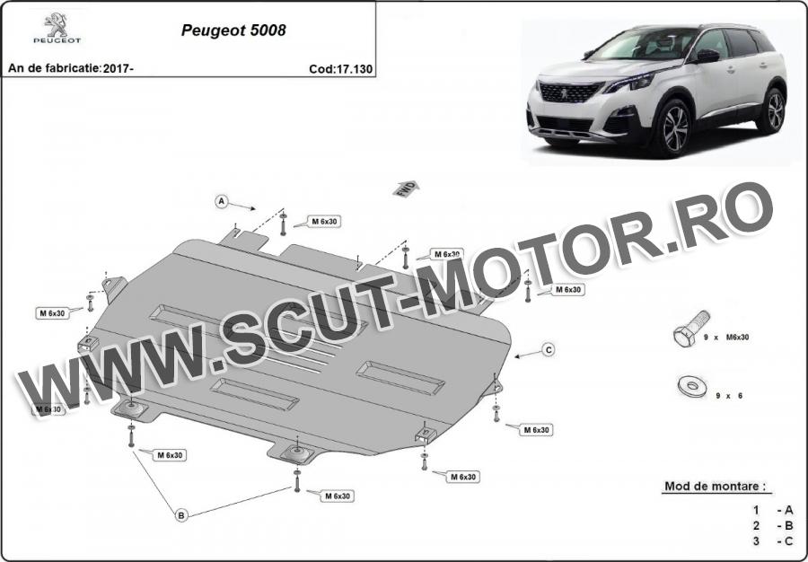 Scutul este noua si se potriveste perfect pentru toate tipurile de motorizare Peugeot 5008 fabricat între ani 2017 - 2026. Scutul protejeazã: motor, cutie de viteză, radiator.