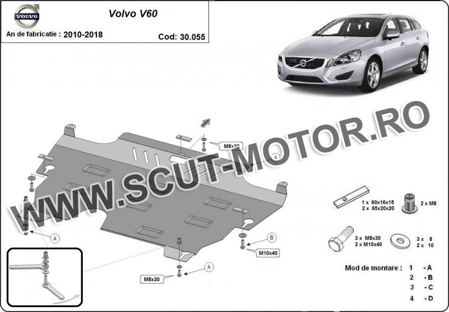 Scutul este noua si se potriveste perfect pentru toate tipurile de motorizare Volvo V60 fabricat între ani 2010 - 2018. Scutul protejeazã: motor, cutie de viteză, radiator.