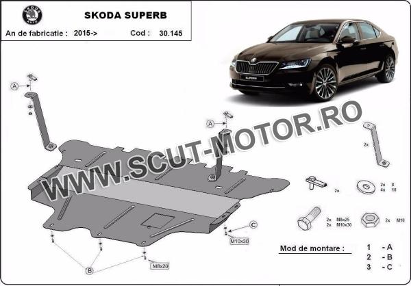 Scutul este noua si se potriveste perfect pentru toate tipurile de motorizare Skoda Superb fabricat între ani 2015 - 2024. Scutul protejeazã: motor, cutie de viteză, radiator, bara față.