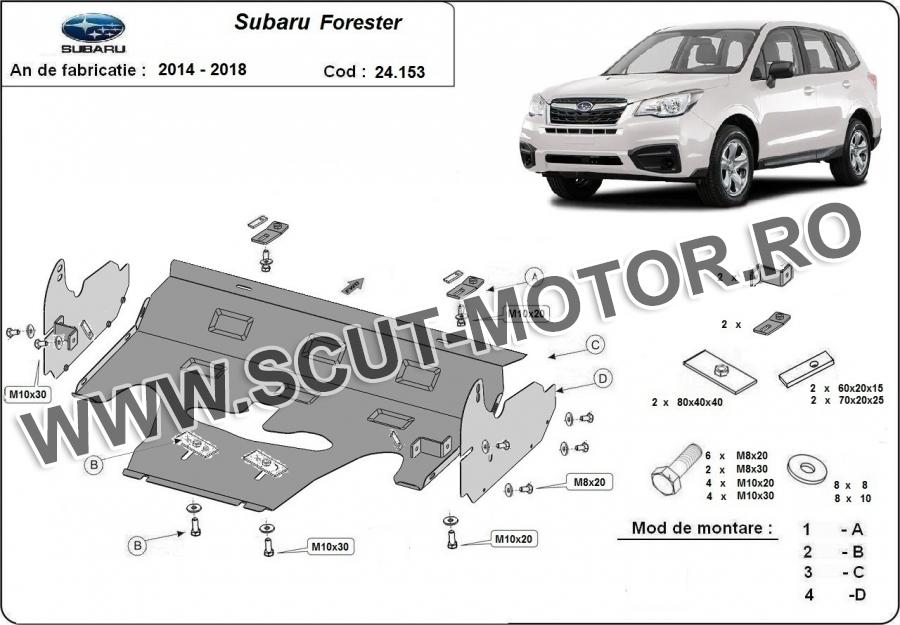 Scutul este noua si se potriveste perfect pentru toate tipurile de motorizare Subaru Forester 4 fabricat între ani 2014 - 2018. Scutul protejeazã: motor, radiator.