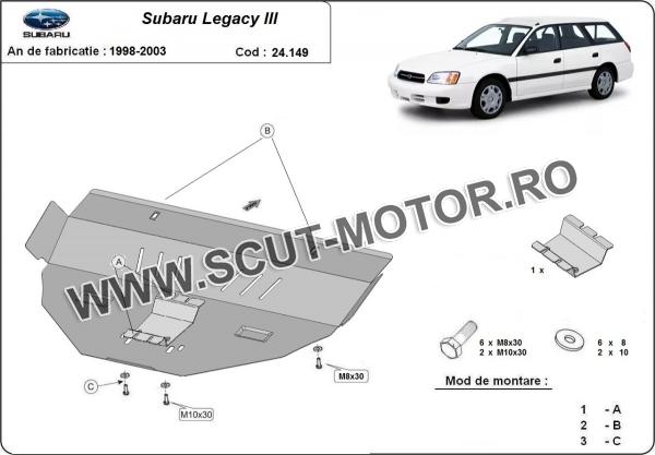 Scutul este noua si se potriveste perfect pentru toate tipurile de motorizare Subaru Legacy III fabricat între ani 1998 - 2003. Scutul protejeazã: motor, cutie de viteză, radiator.