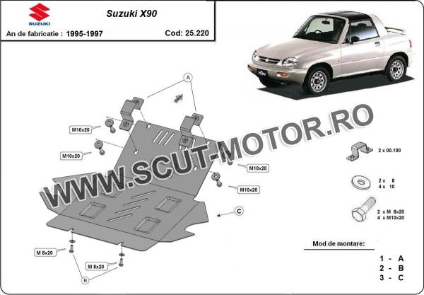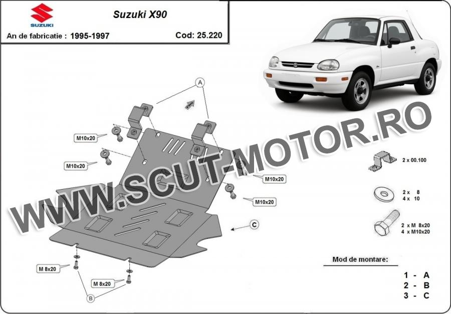 Scutul este noua si se potriveste perfect pentru toate tipurile de motorizare Suzuki 90 fabricat între ani 1995 - 1997. Scutul protejeazã: motor, radiator.