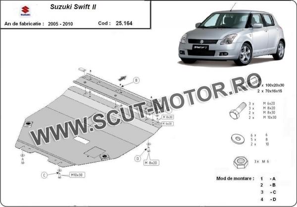 Scutul este noua si se potriveste perfect pentru toate tipurile de motorizare Suzuki Swift II fabricat între ani 2005 - 2010. Scutul protejeazã: motor, cutie de viteză.