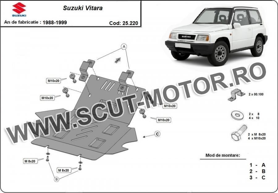 Scutul este noua si se potriveste perfect pentru toate tipurile de motorizare Suzuki Vitara fabricat între ani 1988 - 1999. Scutul protejeazã: motor, radiator.