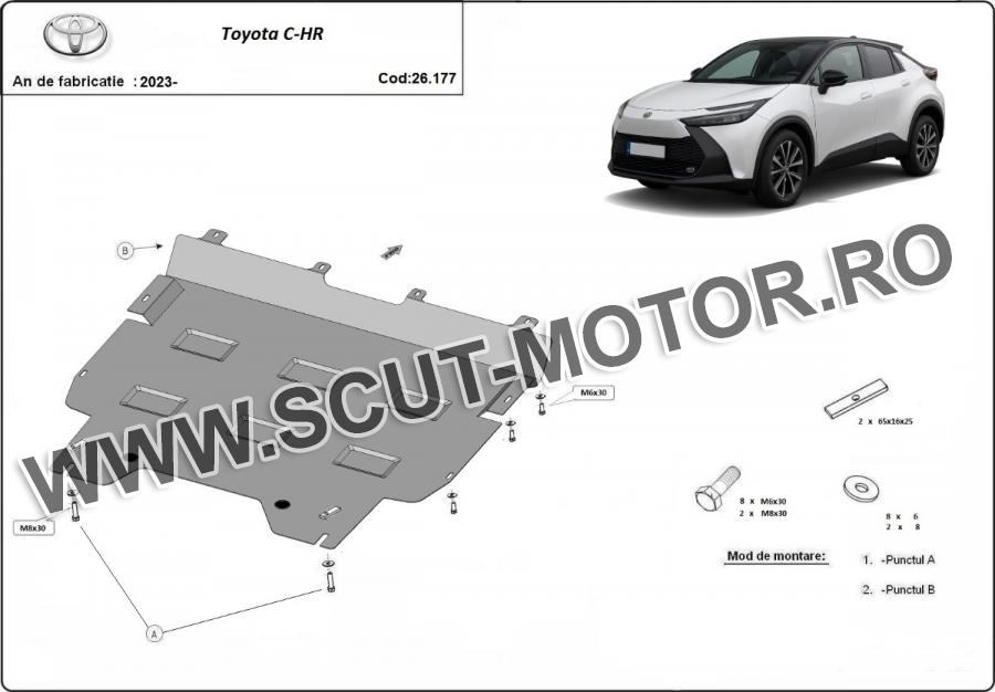 Scutul este noua si se potriveste perfect pentru toate tipurile de motorizare Toyota C-HR fabricat între ani 2023 - 2025. Scutul protejeazã: motor, cutie de viteză, radiator.