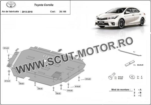 Scutul este noua si se potriveste perfect pentru toate tipurile de motorizare Scut motor Toyota Corolla fabricat între ani 2013 - 2018. Scutul protejeazã: motor.