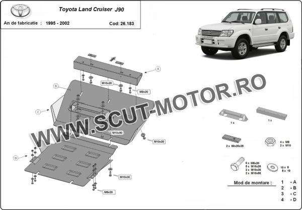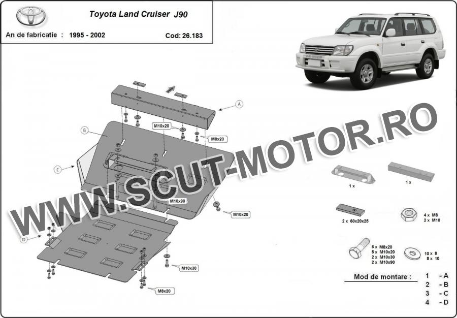 Scutul este noua si se potriveste perfect pentru toate tipurile de motorizare Toyota Land Cruiser J100 fabricat între ani 1995 - 2002. Scutul protejeazã: motor, radiator, bara față.
