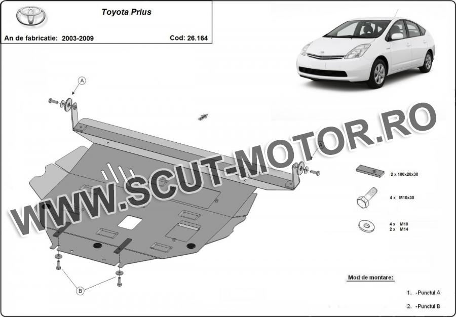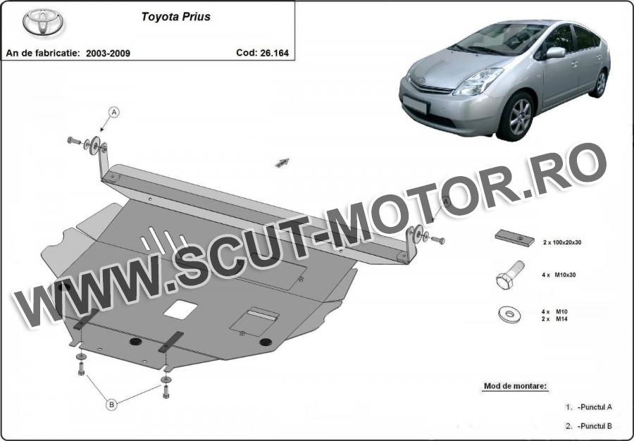 Scutul este noua si se potriveste perfect pentru toate tipurile de motorizare Toyota Prius fabricat între ani 2003 - 2009. Scutul protejeazã: motor, cutie de viteză, radiator.