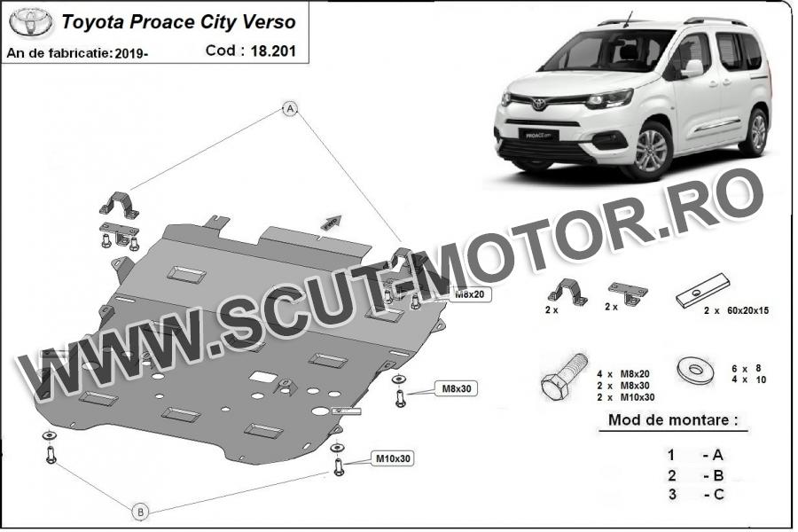 Scutul este noua si se potriveste perfect pentru toate tipurile de motorizare Toyota Proace fabricat între ani 2019 - 2026. Scutul protejeazã: motor, cutie de viteză, radiator, bara față.