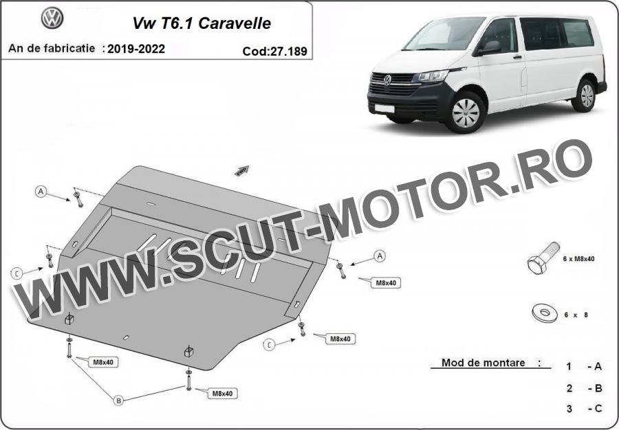 Scutul este noua si se potriveste perfect pentru toate tipurile de motorizare Volkswagen Transporter Caravelle fabricat între ani 2019 - 2022. Scutul protejeazã: motor, cutie de viteză, radiator, bara față.