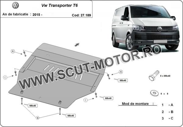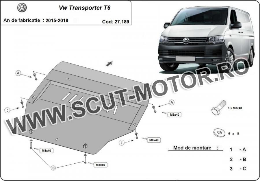 Scutul este noua si se potriveste perfect pentru toate tipurile de motorizare Volkswagen Transporter T6 fabricat între ani 2015 - 2019. Scutul protejeazã: motor, cutie de viteză, radiator, bara față.