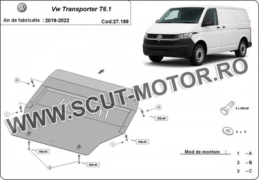 Scutul este noua si se potriveste perfect pentru tipurile de motorizare Toate - Volkswagen Transporter T6.1 fabricat între ani 2019 - 2022. Scutul protejeazã: motor, cutie de viteză, radiator, bara față.